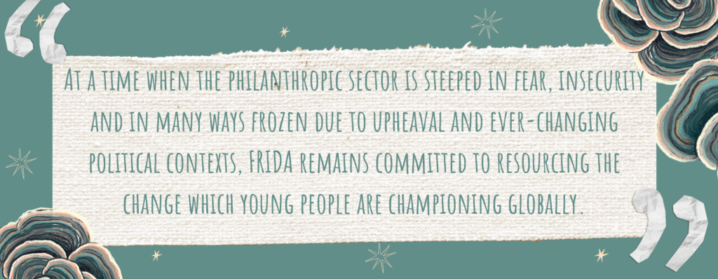 At a time when the philanthropic sector is steeped in fear, insecurity and in many ways frozen due to upheaval and ever-changing political contexts, FRIDA remains committed to resourcing the change which young people are championing globally. We are holding the line, guided by the very same principles and values that built FRIDA, and trusting them to take us through this moment, because young feminists are not just inheriting movements, they are reinventing them. They are imagining possibilities beyond the limits of traditional organizing. And whilst their innovation and vision is often lauded, larger philanthropic institutions rarely invest in them. Resourcing young feminist movements is an essential part of sustaining the evolution, creativity, and resilience of the social justice ecosystem. The future of young feminist organizing depends on the autonomy, power, and leadership of young people, and when we fund young feminist movements we contribute directly to keeping our movements alive, and responsive to the world around us. In this spirit, FRIDA will continue to fund and play our role as an incubator for the next generation of social justice movements.
